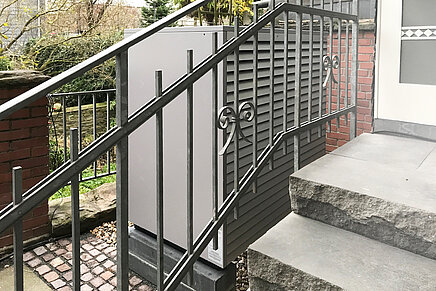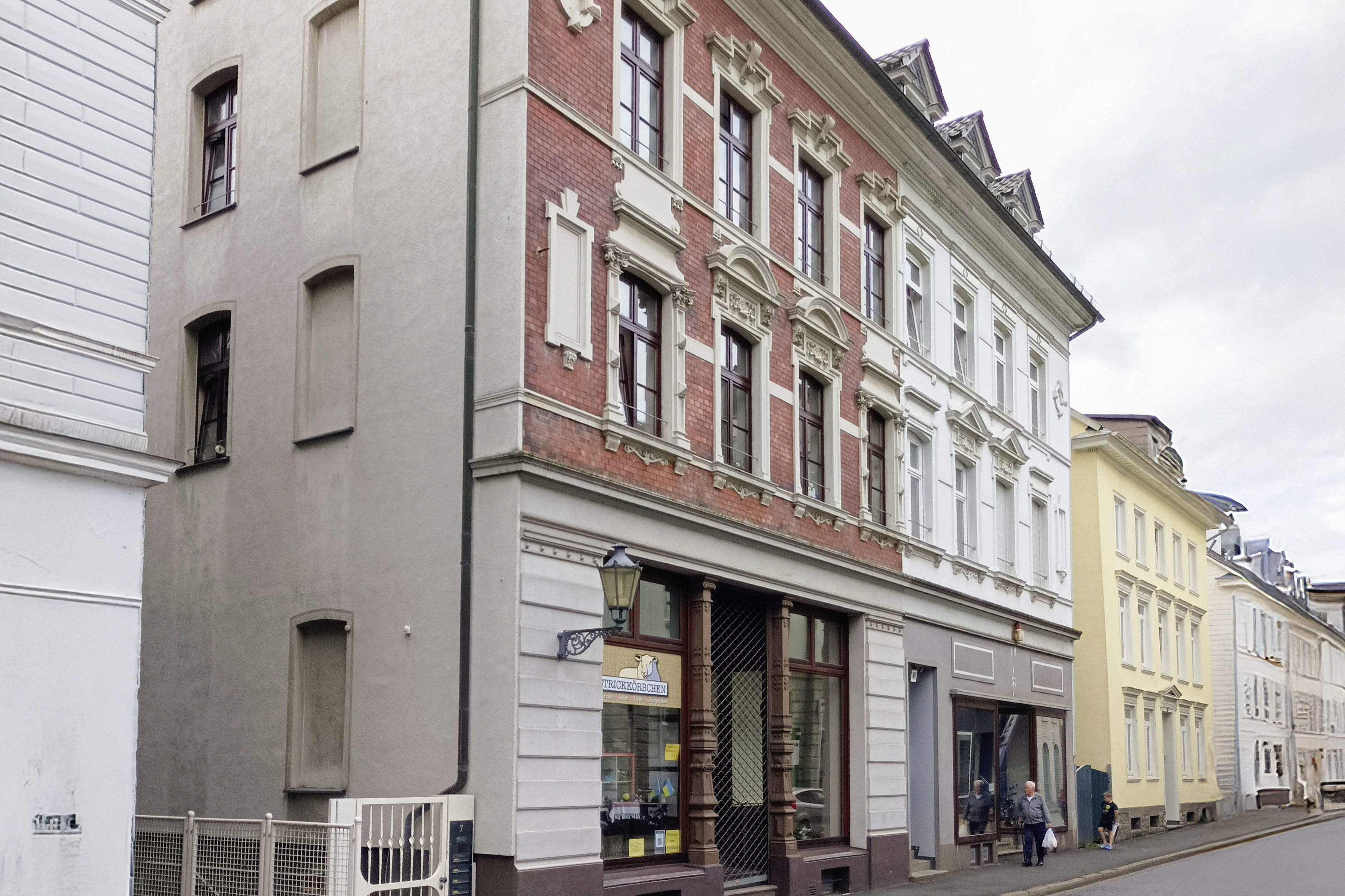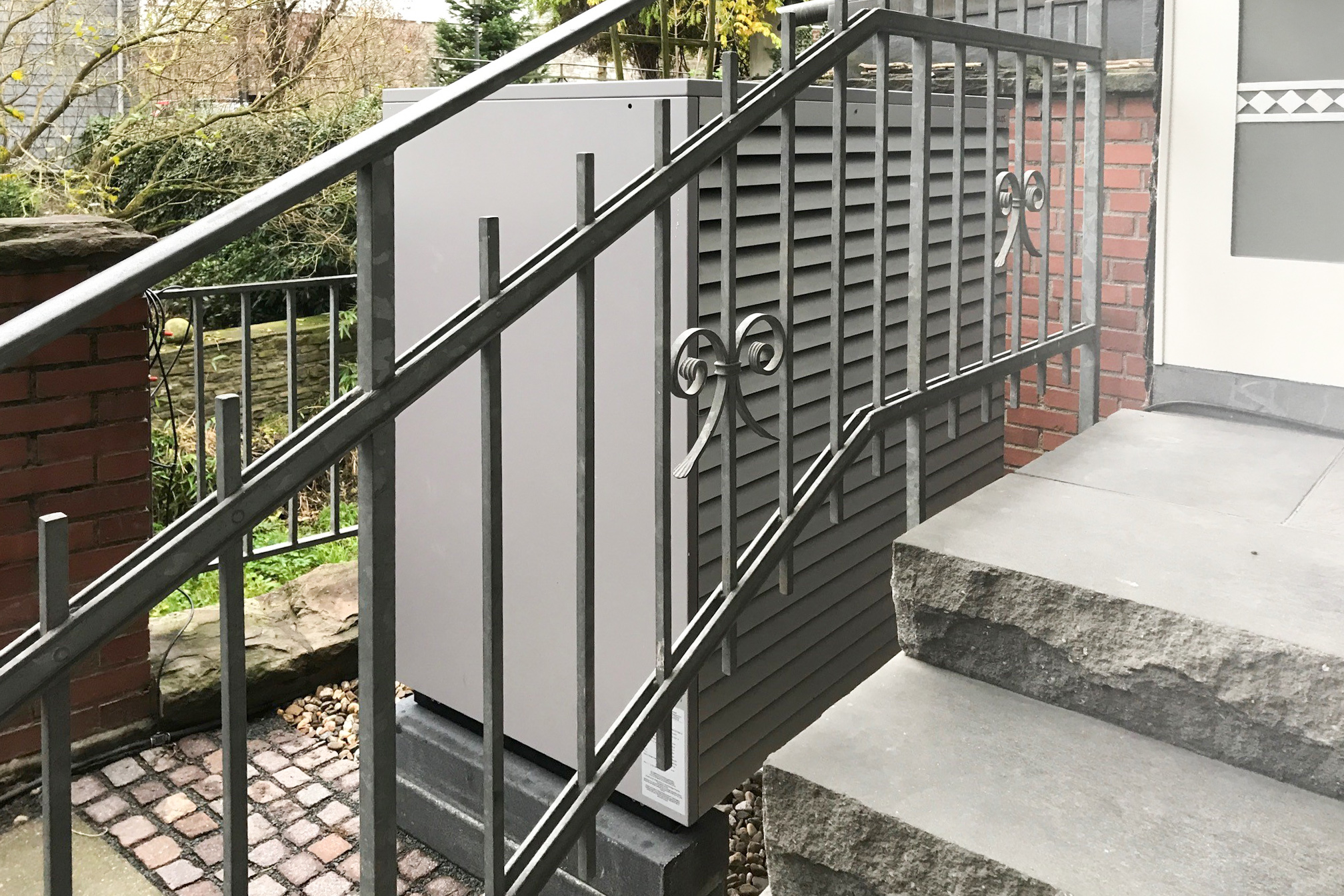 V dôsledku škôd spôsobených prívalovým dažďom muselo byť v bytovom a obchodnom dome s tromi bytmi a dvoma obchodnými prevádzkami nahradené existujúce olejové kúrenie, ktoré bolo s výkonom 34 kW predimenzované. Pre dom postavený v roku 1875 s obytnou plochou 277 štvorcových metrov bolo zvolené modulačné tepelné čerpadlo vzduch/voda Weishaupt Biblock® s tepelným výkonom 5,6 až 16,6 kW (pri A2/W35), vrátane akumulačného zásobníka. Napriek veľmi stiesneným podmienkam na pozemku sa podarilo nájsť miesto na inštaláciu vonkajšej jednotky tepelného čerpadla, ktoré bolo vyhovujúce z hľadiska objemového prúdenia vzduchu a akustických emisií. Bolo potrebné vymeniť iba jeden z existujúcich radiátorov. Vykurovacia krivka bola nastavená na výstupnú teplotu 55 °C pri vonkajšej teplote -10 °C. Príprava teplej vody prebieha naďalej decentralizovane pomocou elektrických prietokových ohrievačov.